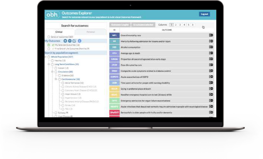The OBH Outcomes Explorer tool enables users to view all outcomes in the Outcomes Library, and forms part of the OBH Outcomes Platform suite of technology solutions.