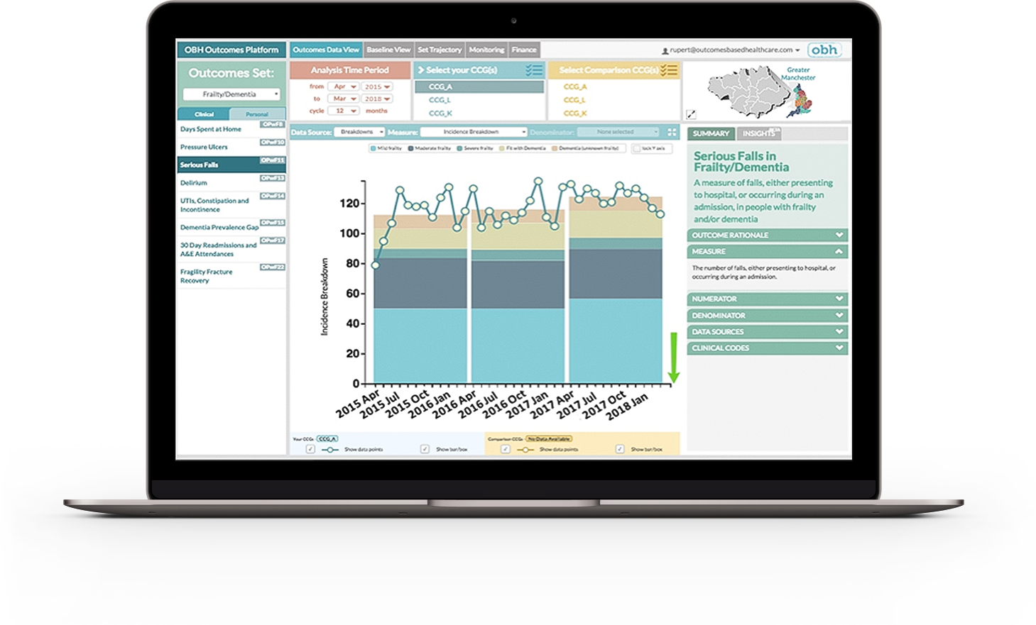 • Offers intuitive visualisations of outcomes data, with Statistical Process Control to understand trends