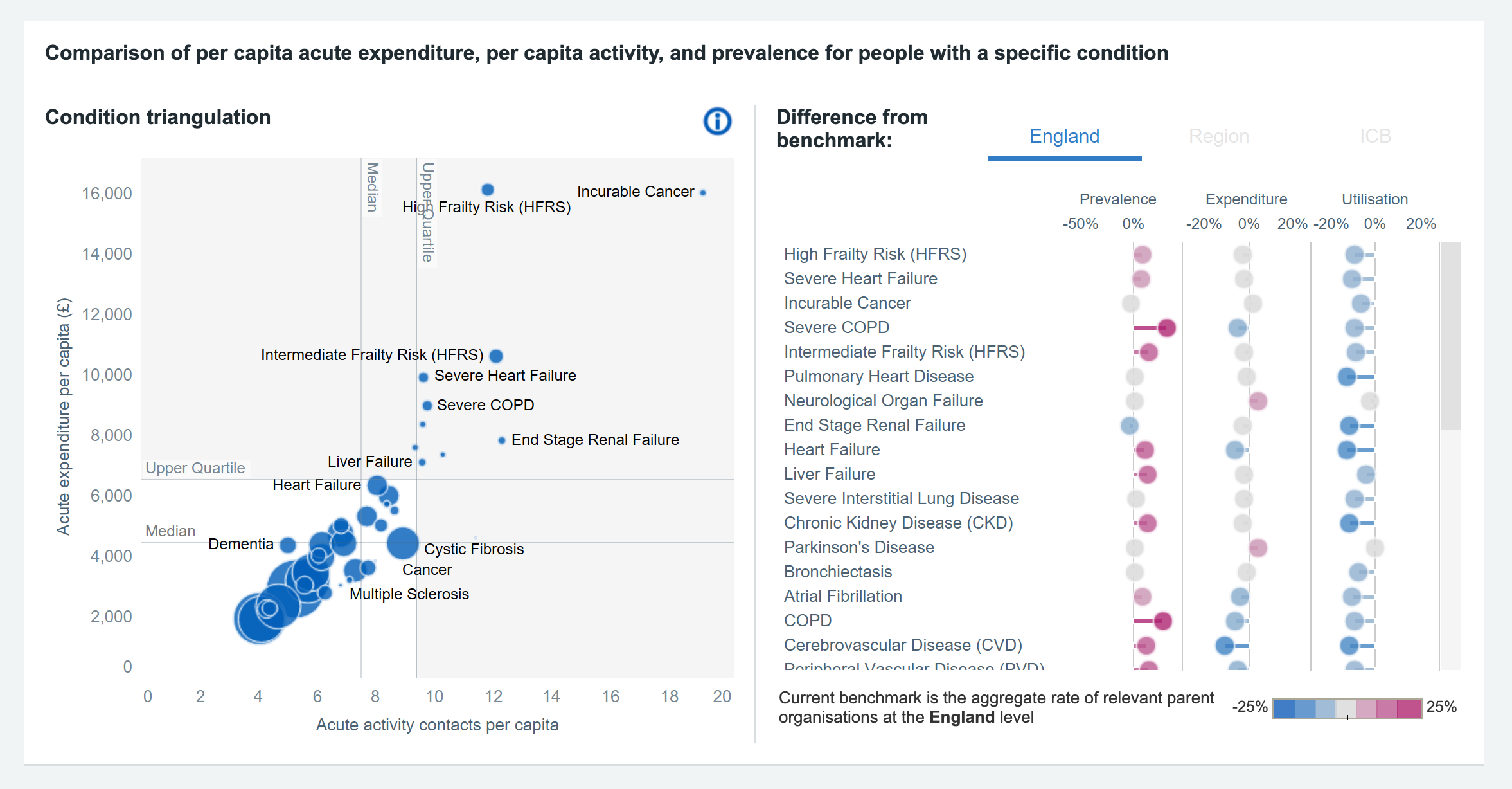 The Population and Person Insights (PaPI) Dashboard is intended to support decision making in health and care. The data views provide analysts and decision makers a range of insights on population groups, their health acuity, associated costs of services and their outcomes.